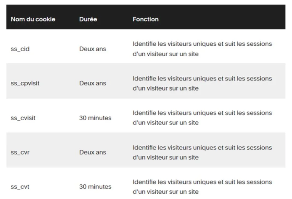Les cookies n’identifient pas directement un Utilisateur puisqu’ils ne contiennent ni nom ni prénom. Le navigateur du terminal s’en charge. Par ailleurs, le terme « cookies » peut désigner des technologies différentes, à l’instar des balises ou images numériques invisibles intégrées sur les pages web ou dans les courriels. En règle générale, la durée de vie d’un cookie est de treize mois au maximum après son enregistrement dans l’espace de stockage de la machine. Elle ne peut être prolongée au cours des nouvelles visites sur la plateforme.